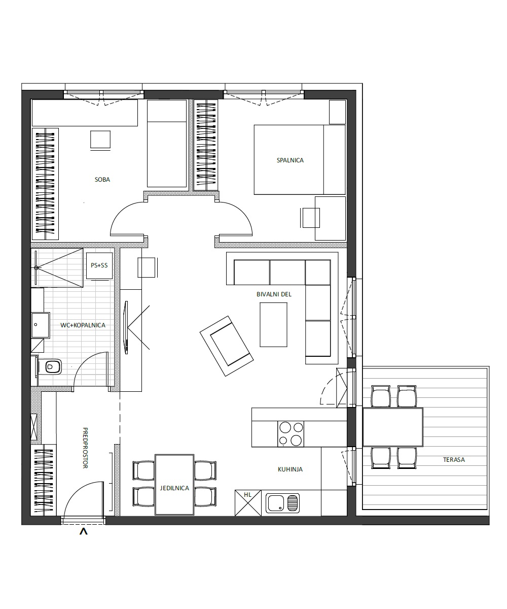 Kuhinja+jedilnica+bivalni del    34,17 m2