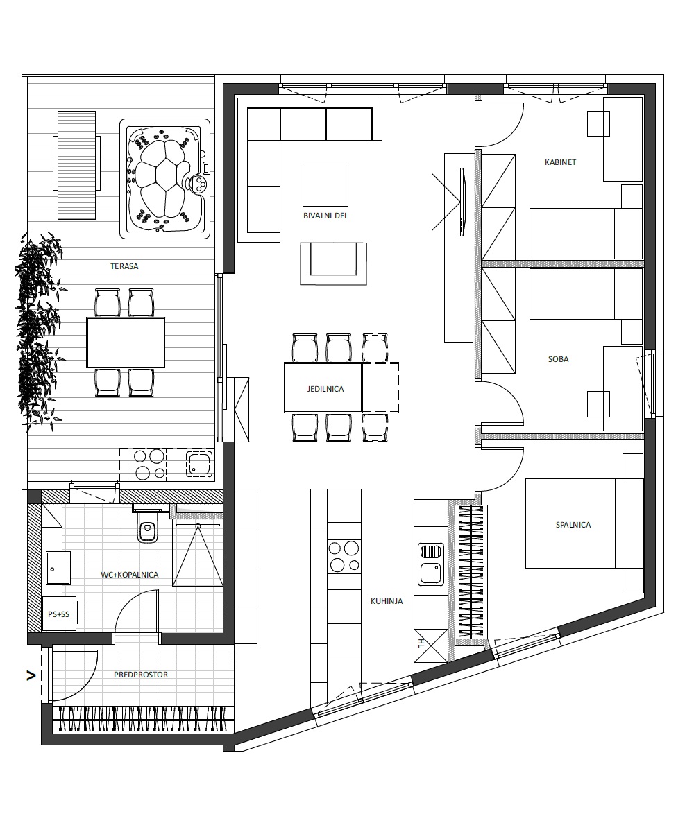 Kuhinja+jedilnica+bivalni del 44,35 m2